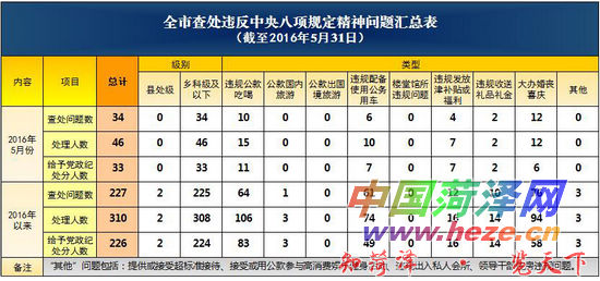 2016年以来,截至5月31日,全市共查处违反中央八项规定精神问题227起,处理310人,给予党政纪处分226人。