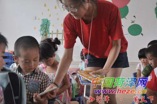 中国菏泽网消息(记者 忠法 通讯员 杨杰)当同学们纷纷背上行囊,踏上回家的旅程的时候,7月13日,菏泽学院文学与传播系师生、菏泽学院阳光Smile志愿者协会一行顶着炎炎夏日来到定陶区孟海镇中心幼儿园,开展“助力菏泽教育,筑梦留守课堂”的支教活动。文学与传播系为孩子们带来了300《弟子规》、《三字经》、《论语》等国学经典图书,并给孩子们发放了文具盒和练习本。