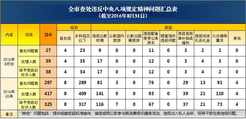 2016年以来,截至8月31日,全市共查处违反中央八项规定精神问题297起,处理417人,给予党政纪处分325人。