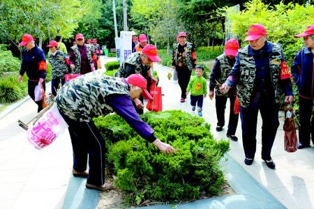 在活动开始前,老人们首先观看了精彩的歌舞表演。演出结束后,老人们纷纷拿起夹子、手套等工具,看到路边的落叶、纸屑,马上捡起来,放进随身携带的垃圾袋内(如图)。虽然老人们年纪都很大了,但是却干得非常认真,只要是他们走过的地方,全部一尘不染,地面没有一点垃圾。