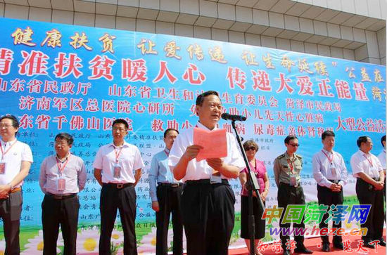 据介绍,活动由山东省民政厅、山东省卫计委精准扶贫办、菏泽市政府、菏泽市民政局、公益中国慈善联盟·山东分会、山东广播电视台《公益山东》栏目、山东健康咨询网携手山东省千佛山医院、济南军区总医院心研所、山东省扶贫基金开发会、山东省慈善总会、山东省红十字会、爱佑基金、神华基金、小天使基金 、中华儿慈会基金、中国社会福利基金会市长助学公益基金联合举行。