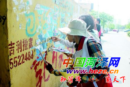 当日上午八点半,志愿者准时集结,分工协作,拿起铲子、塑料袋、扫帚等工具,兵分八路,前往菏泽开发区丹阳办事处的各主要街道、路口、沿街门市。