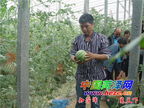 6月19日,曹县倪集街道办事处宋炉庙村鸿运家庭农场场长宋孝印正在向记者展示他种的西瓜。据了解,两年前,他流转土地300亩,建设标准式大棚10个,种植了西瓜、甜瓜、水果西红柿、草莓等,全部施用农家肥、豆泊、香油下脚料等,无公害纯绿色,西瓜每公斤卖到3.5元,每天来采摘的游客络绎不绝。 通讯员 宋银生 记者 臧宾 摄