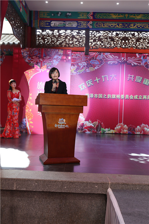 高强讲到,旗袍,这一典雅服饰是传播中华品牌文化的重要载体,是优秀中国传统文化的一部分。菏泽市国之韵旗袍委员会成立两年来,时刻不忘初心,始终践行“旗袍修身 善美修心”的宗旨,并以旗袍为名片,精心设计活动,开展了在社会上影响力很大的“千人旗袍秀走进曹州牡丹园”、旗袍快闪“助力创城”、走进养老院等丰富多彩的活动,充分展示了菏泽女性的优雅、美丽、智慧和自信的精神风貌,传递了现代文明,展示了大美菏泽经济文化的创新成果,为菏泽城市精神文明建设贡献了一份巾帼力量,成为幸福和谐美丽菏泽的一道不可或缺的风景线。