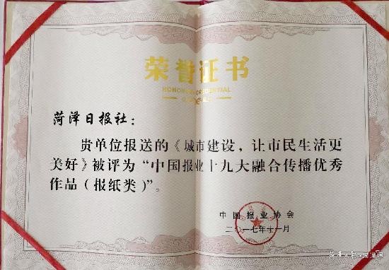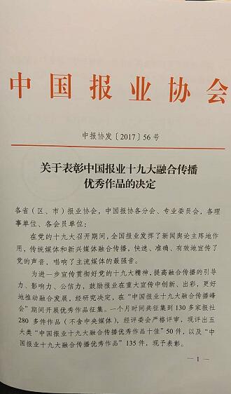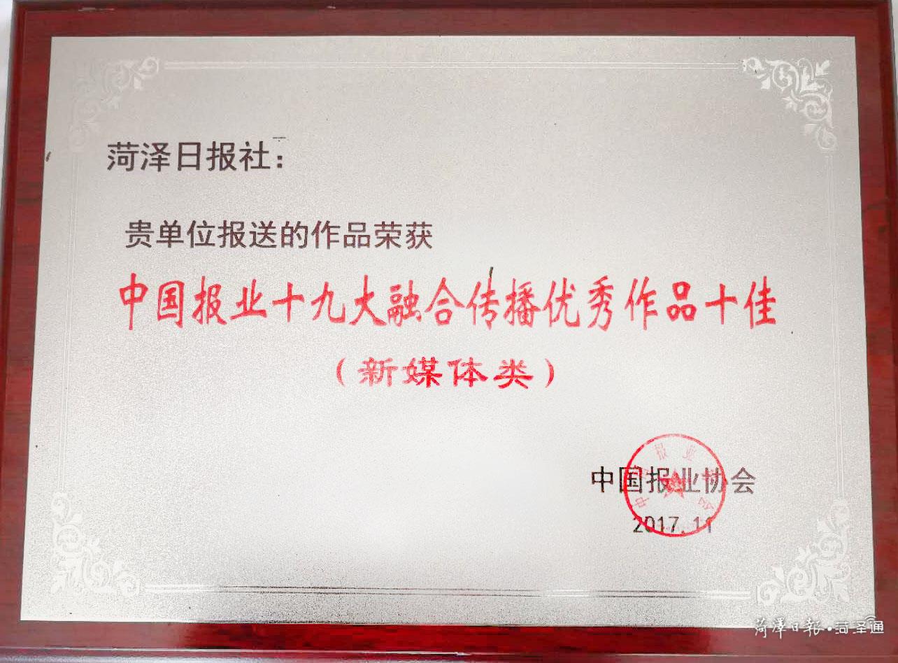 为进一步宣传贯彻好党的十九大精神,提高媒体融合传播的引导力、影响力、公信力,鼓励报业在重大宣传中创新、出彩,更好地推动融合发展,中国报业协会自10月20日开展了"中国报业十九大融合传播优秀作品"征集,一个月时间共征集到130多家报社280多件作品(不含中央媒体),经评委会严格评审,评出5大类“中国报业十九大融合传播优秀作品十佳”50件,“中国报业十九大融合传播优秀作品”135件。其中,本报选送的两件作品,记者张啸采写的通讯《城市建设,让市民生活更美好》获得“中国报业十九大融合传播优秀作品”奖(报纸类),新闻客户端菏泽通《党的十九大》专题获“中国报业十九大融合传播优秀作品十佳”奖(新媒体类)。