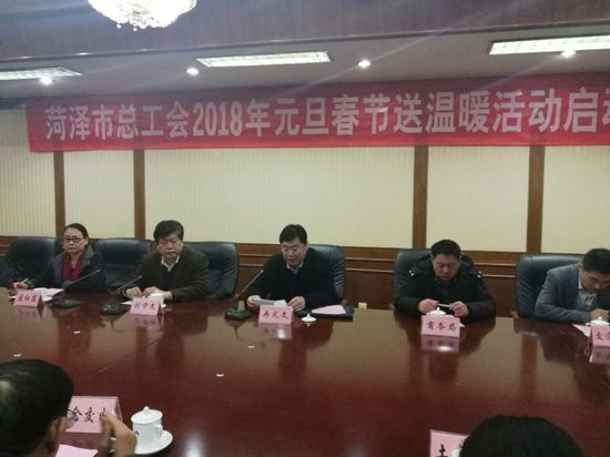 中国菏泽网消息(记者 李立)12月28日,菏泽市工会2018年元旦、春节送温暖活动启动仪式正式举行,向困难企业和困难职工代表发放慰问金,让其度过一个安心、欢乐、祥和的“双节”。市总工会党组书记、常务副主席刘守文,市直部分大系统大单位的工会主席,困难职工代表,以及部分媒体到场参加。