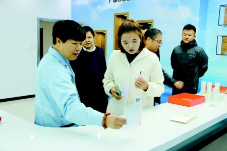 本报记者图①记者杨飞在威顿(郓城)玻璃制品有限公司进行采访。