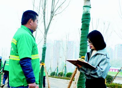 图③记者张品在市区桂陵路园林施工现场,采访绿化苗木栽种情况。