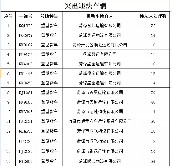 其中包括:鲁RQ1879、鲁RM4008 等19辆违法未处理次数较多的车辆,鲁RM3273、鲁RN7781等14辆存在闯禁区违法行为的车辆。(统计时间截止至2019年12月24日)