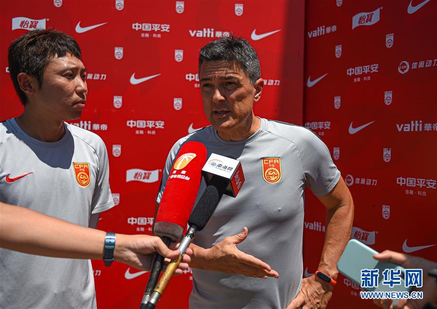 5月25日,中国男足U16国少队主教练安东尼奥(右)在训练后接受采访。 当日,中国男足U16国少队在海口观澜湖足球基地训练,备战巴林亚少赛。 新华社记者蒲晓旭摄