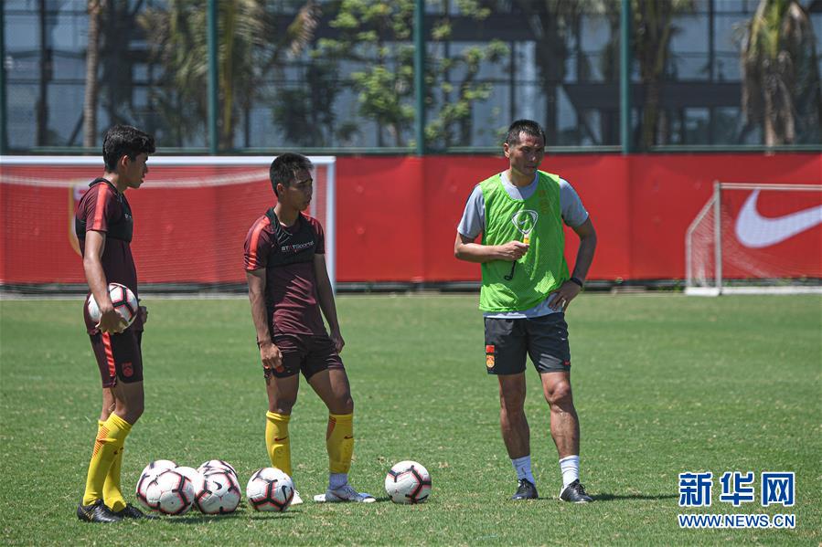 5月25日,中国男足U16国少队领队邵佳一(右)与队员在训练中。 当日,中国男足U16国少队在海口观澜湖足球基地训练,备战巴林亚少赛。 新华社记者蒲晓旭摄