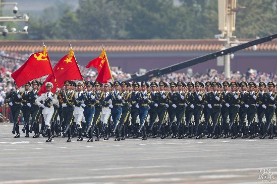 △2019年国庆阅兵仪式上,仪仗方队护卫党旗、国旗、军旗走在徒步方队的最前方。