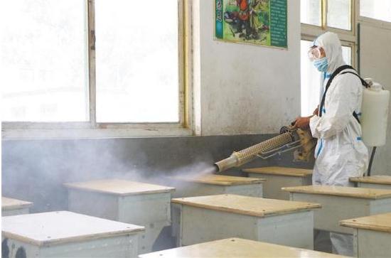 5月23日,定陶区天马义务救援队10余名志愿者走进冉堌镇第二学区田集小学,免费为学校开展消杀作业。志愿者自带消毒药水和专业设备,依次对教室、走廊、大厅等地进行全方位消毒。据了解,疫情发生以来,定陶区天马义务救援队便不间断开展进校园义务消毒活动。截至目前,已对全区大部分学校开展了消杀工作。记者 王振宇 摄