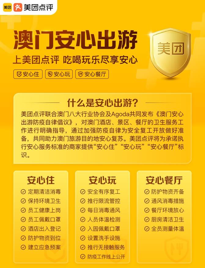 美团将向更多的平台商户进行《倡议》推广,并以大数据等技术支持推动“手机预订酒店”“手机预约购票”“手机团购订餐”等无接触服务在中国澳门的落地。同时,美团还会为承诺执行安心服务标准的商家打上“安心住”“安心玩”以及“安心餐厅”标识。这标志着境外首个“安心”系列服务产品落地。