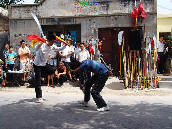 6月20日上午,牡丹区西城办事处南华社区街道上锣鼓喧天,人头攒动,近千名居民冒着酷暑在欣赏精彩的八卦掌表演。