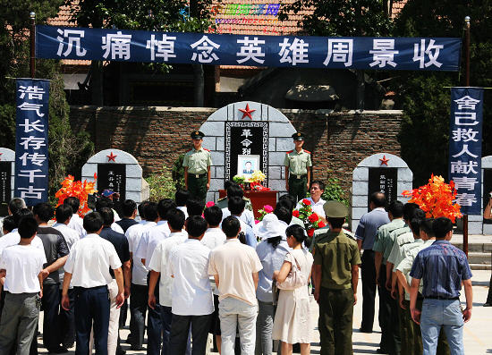 7月2日,定陶籍武警战士周景收的骨灰在战友和亲人的陪伴下回到家乡,安葬在定陶县烈士陵园内。定陶县各界群众300多人自发前来送别。6月26日,周景收在参与解救遇险群众时献出了年仅20岁的生命。周景收生前所在的武警辽宁省总队党委批准其为烈士,追认其为中国共产党正式党员,追记一等功。