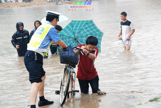 防汛部门相继开启位于牡丹区南城办事处的三角闸排水系统、位于双河路旁的丁堤口水闸排水系统,并派人冒雨排除道路积水。当日上午11时,市消防支队一中队派消防队员紧急排除市实验小学南校区的积水(图)。截至13日15时30分,市区青年路、牡丹路、丹阳路等道路积水已基本排除,恢复通行。