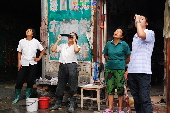 22日上午,在市区太原路一洗车行,洗车师傅们观看日食,云量多时干脆直接“裸眼”观看