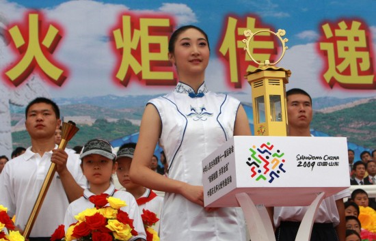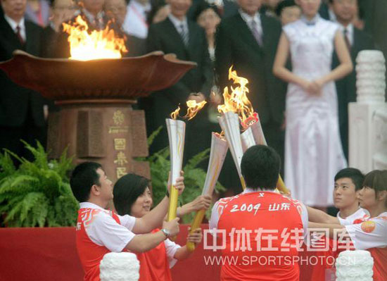 由第十一届全运会的举办地山东省的省委书记姜异康点燃了“国泰民安”圣火坛。