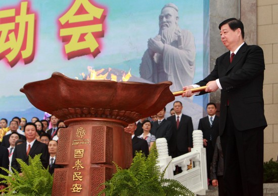 山东省委书记姜异康用点火棒点燃“国泰民安”圣火坛。