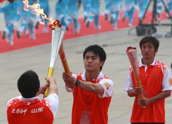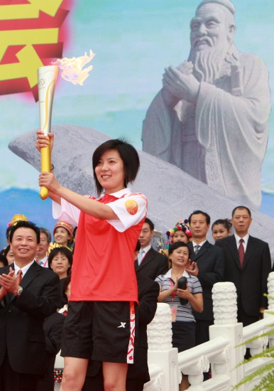 跳水奥运冠军胡佳(中)、拳击奥运冠军邹市明(右)在传递火炬。