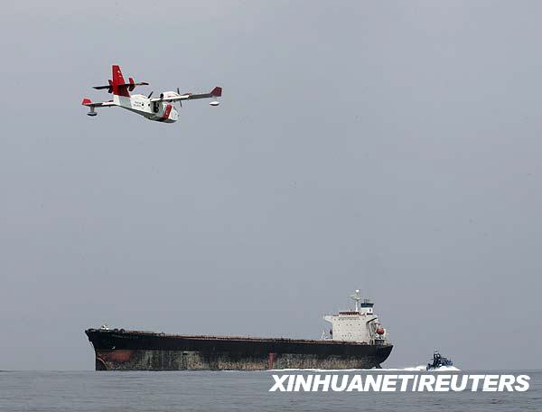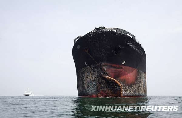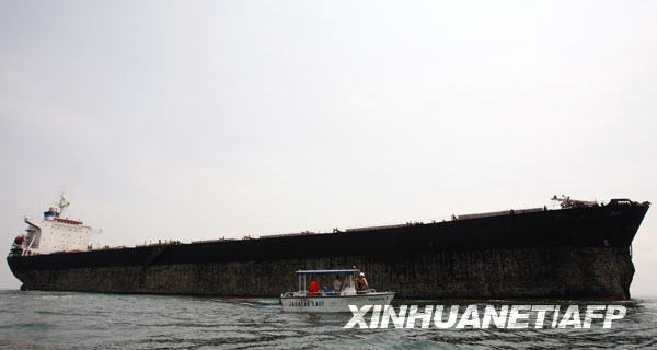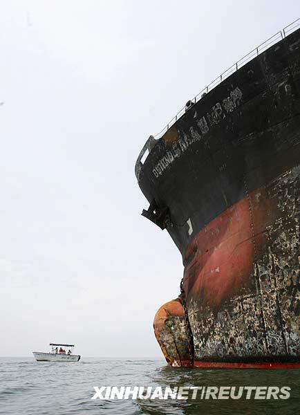 8月19日,在马来西亚森美兰州波德申港口附近,救援人员乘小船查看一艘发生撞船事故的油轮。新华社/法新