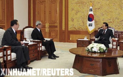 8月23日,韩国总统李明博(右)在首尔总统府会见前来吊唁前总统金大中的朝鲜代表团。 新华社/路透
