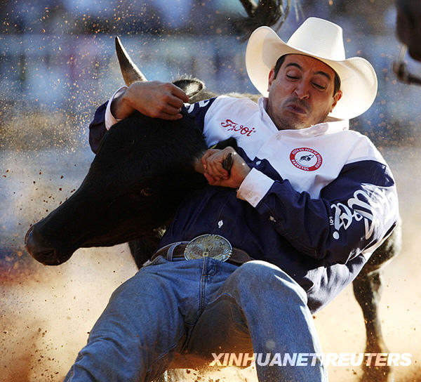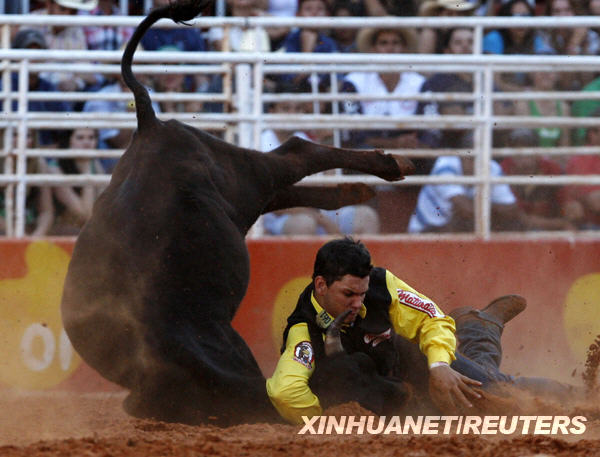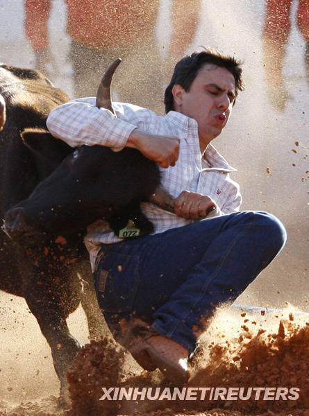 8月30日,一名牛仔在巴西东南部城市巴雷图斯举行的牛仔节上与牛相搏。新华社/路透
