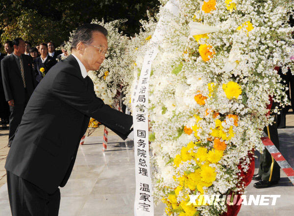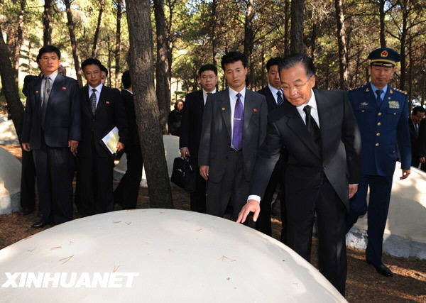 10月5日,温家宝敬献了写着“中国志愿军烈士永垂不朽”的花圈。当日,正在朝鲜进行正式友好访问的中共中央政治局常委、国务院总理温家宝与代表团全体成员、中国驻朝使馆工作人员、在朝中资机构、华侨、留学生代表以及中国青年代表团和艺术团成员等300余人,专程前往桧仓中国人民志愿军烈士陵园凭吊。新华社记者