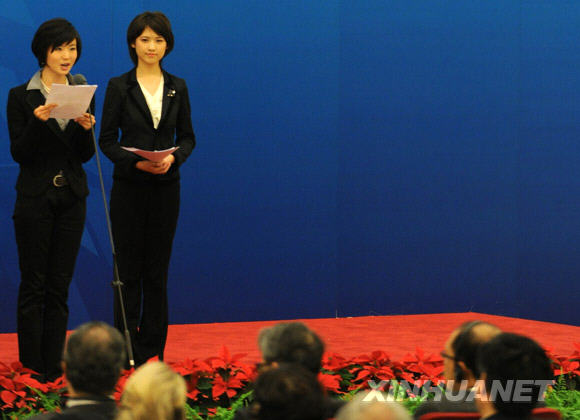 10月10日,工作人员在用中文和英文分别宣读世界媒体峰会共同宣言。当日,世界媒体峰会全体会议通过共同宣言。新华社记者陈树根摄