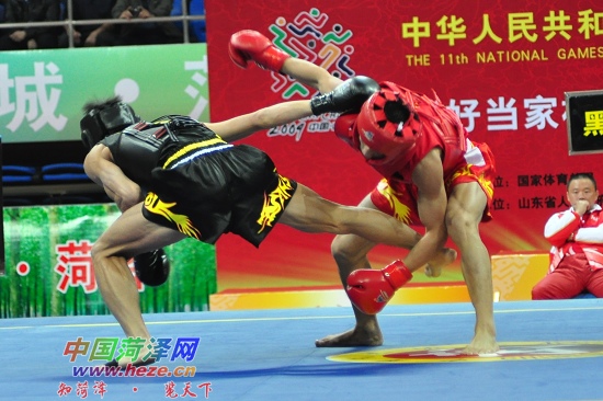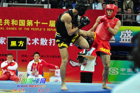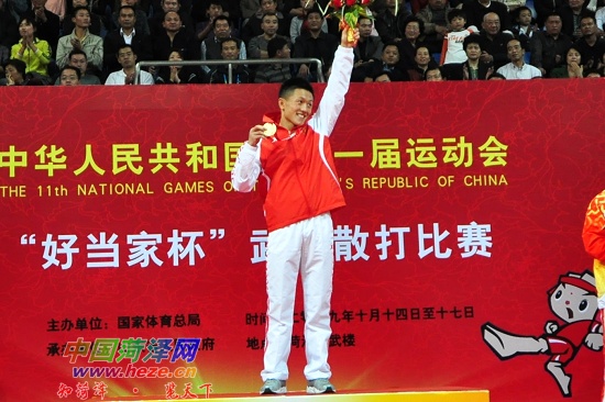 十一运会武术散打比赛男子58公斤级比赛金牌17日晚上在山东菏泽演武楼产生,山东选手李康为东道主摘得首枚武术散打项目的金牌。浙江选手王敏杰获得银牌,解放军选手吴强获得铜牌。