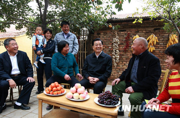10月16日至19日,中共中央总书记、国家主席、中央军委主席胡锦涛在山东省考察工作。这是胡锦涛在东营市广饶县大王镇刘集后村同大王镇党员、干部和刘集后村村民代表围坐在农家小院里,就做好农村党建工作进行交谈。新华社记者