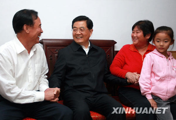 10月16日至19日,中共中央总书记、国家主席、中央军委主席胡锦涛在山东省考察工作。这是10月17日,胡锦涛在淄博市张店区科苑街道潘庄社区看望居民杨长举一家。新华社记者