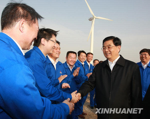 10月16日至19日,中共中央总书记、国家主席、中央军委主席胡锦涛在山东省考察工作。这是10月18日,胡锦涛在考察大唐东营风电项目机组运行情况时同企业员工亲切握手。新华社记者