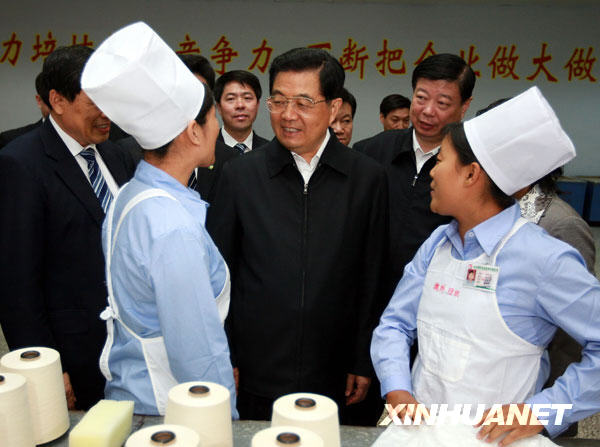 10月16日至19日,中共中央总书记、国家主席、中央军委主席胡锦涛在山东省考察工作。这是10月17日,胡锦涛在山东魏桥创业集团同纺织女工亲切交谈。新华社记者