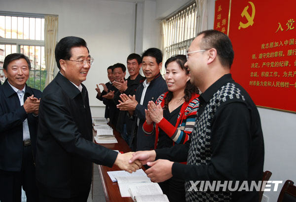 10月16日至19日,中共中央总书记、国家主席、中央军委主席胡锦涛在山东省考察工作。这是10月17日,胡锦涛在淄博市张店区科苑街道潘庄社区党员活动室同党员、干部交谈。新华社记者