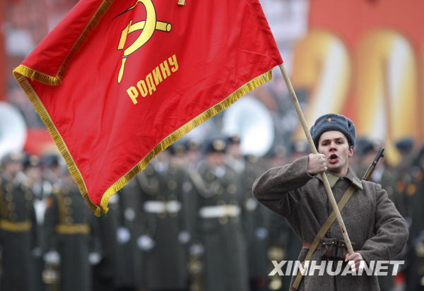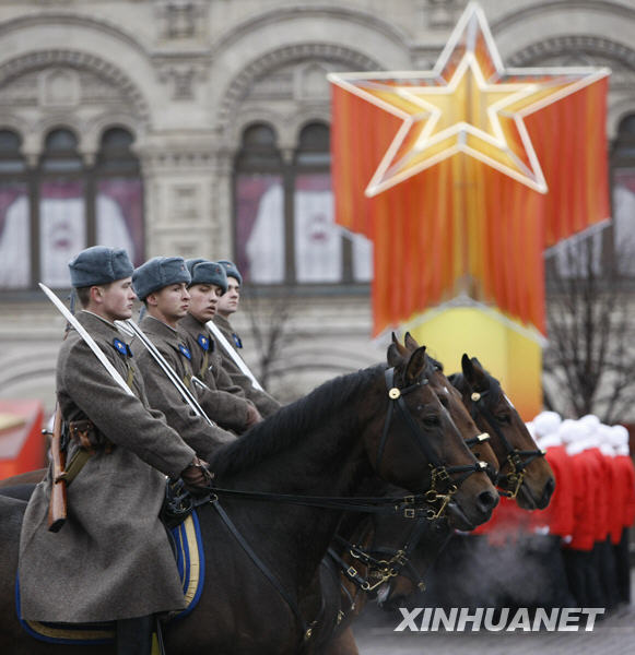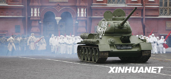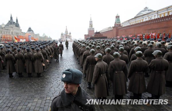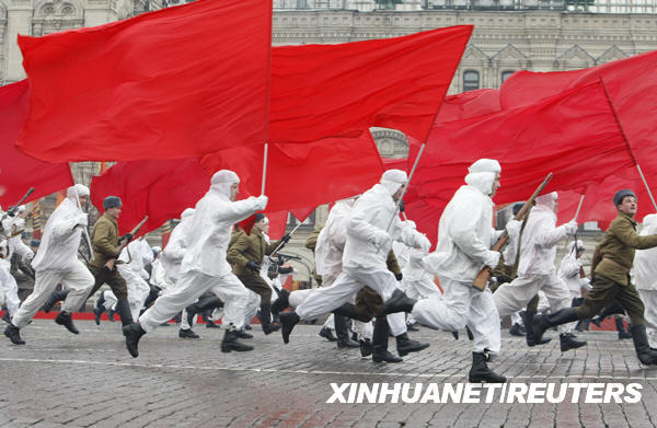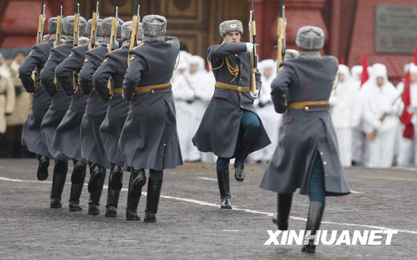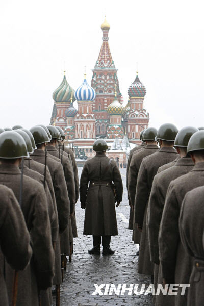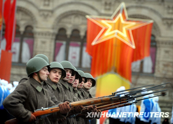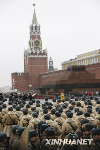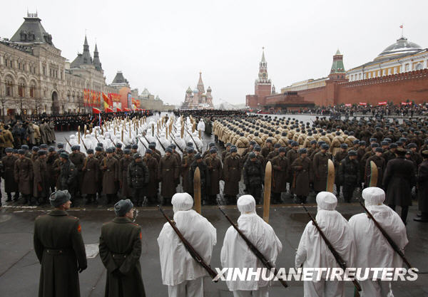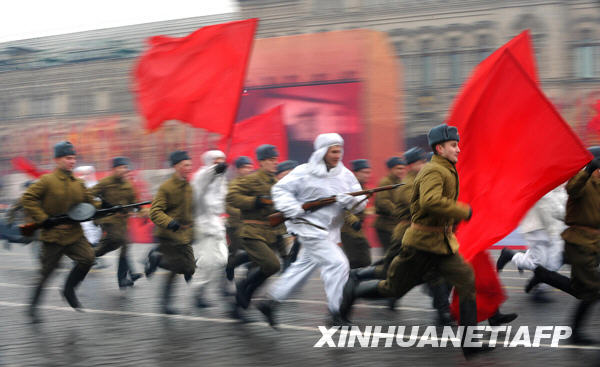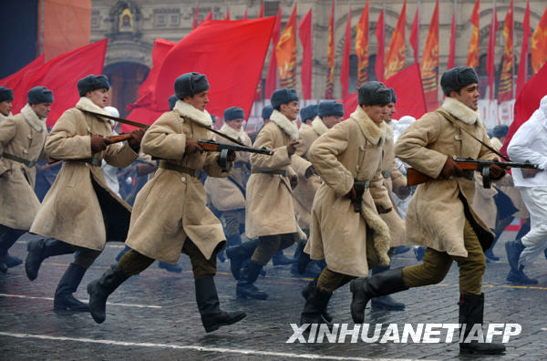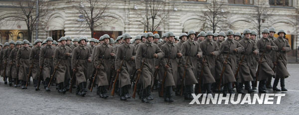 11月7日,在莫斯科红场举行的纪念1941年11月7日红场阅兵式的活动上,俄罗斯士兵模仿当年苏联军队阅兵完毕后直接开赴前线同法西斯德军作战的情形。