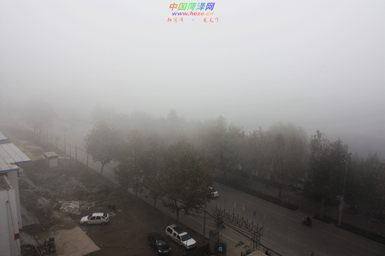 11月24日,一场大雾“锁”住牡丹城,菏泽城区笼罩在朦胧之中,房屋在大雾中若隐若现,而车辆则只能开着雾灯或打着双闪灯在道路上低速行驶。