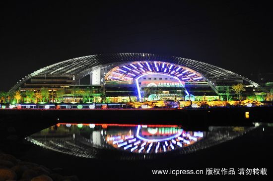 太阳能办公大楼“日月坛-微排大厦”上布满太阳能电池板与发光器。