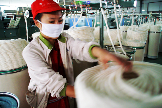 鲁纱纺织是今年以来单县招商引资3亿元兴建的20万纱锭规模的纺织项目,坚持边生产边扩建,目前5万纱锭投入生产,从国外引进生产5万纱锭的最先进设备也在安装调试。项目全部达产后,可实现销售收入6.6亿元、税收2200万元。图为工人在整理棉纱。