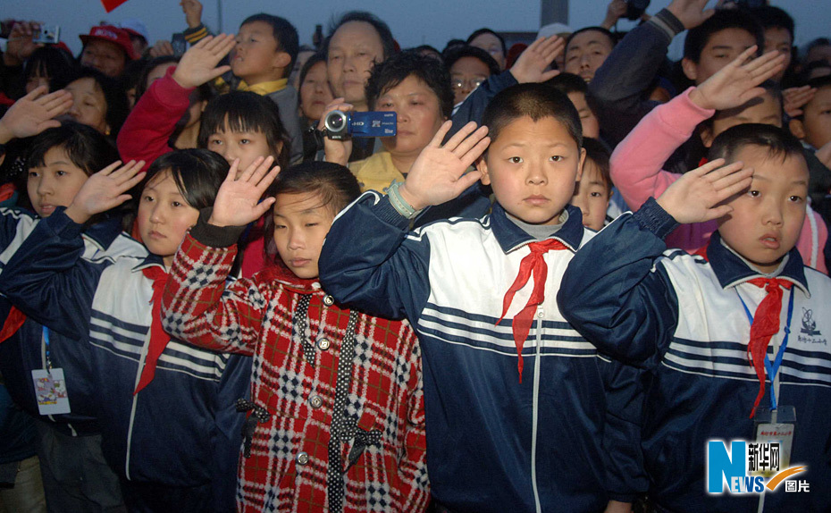 4月21日,北京天安门广场在例行的升国旗仪式后,为青海玉树地震遇难同胞降半旗致哀。这是来自河北廊坊市的小学生向国旗行少先队队礼。新华社记者公磊摄