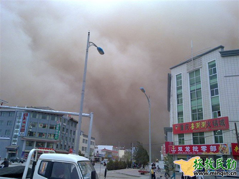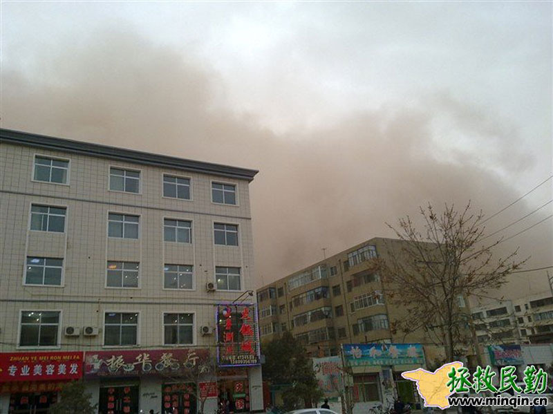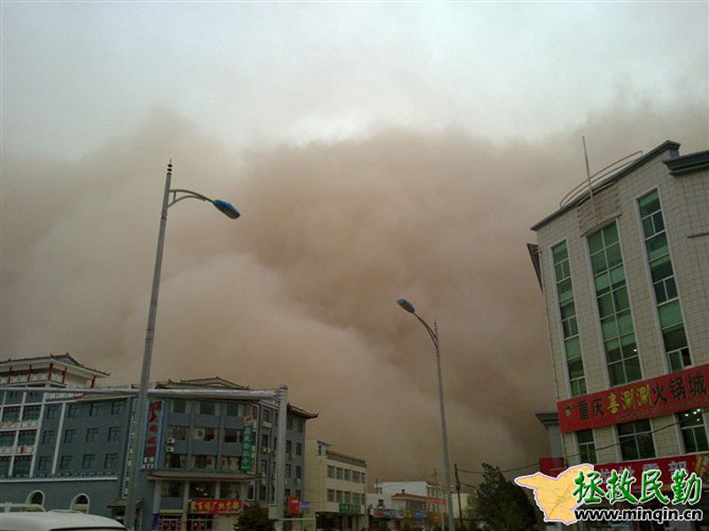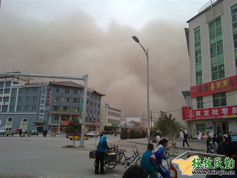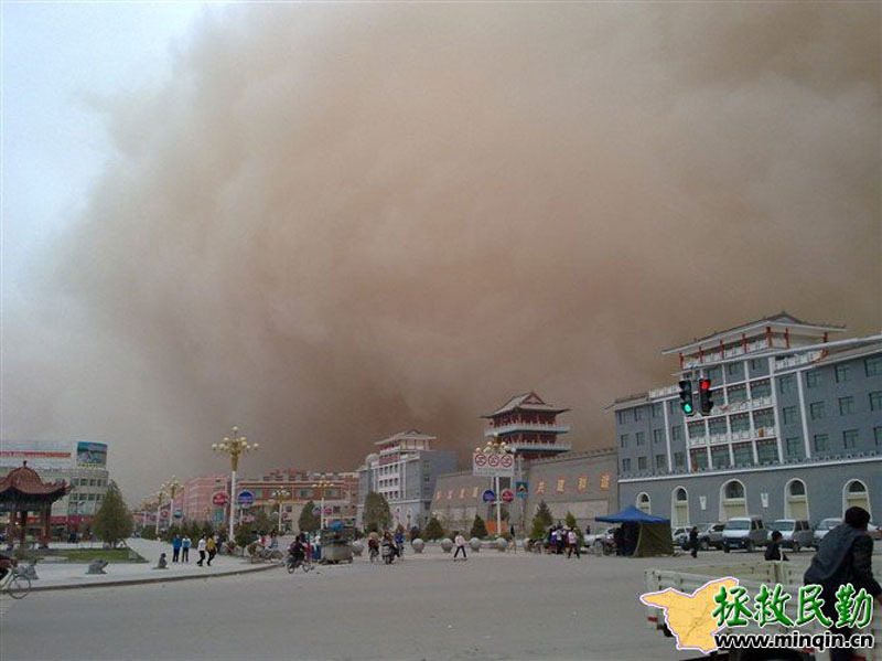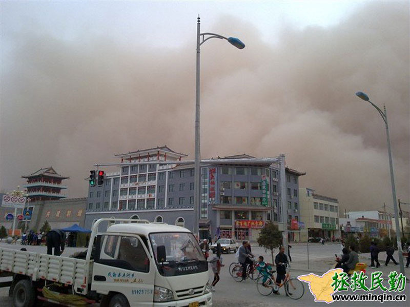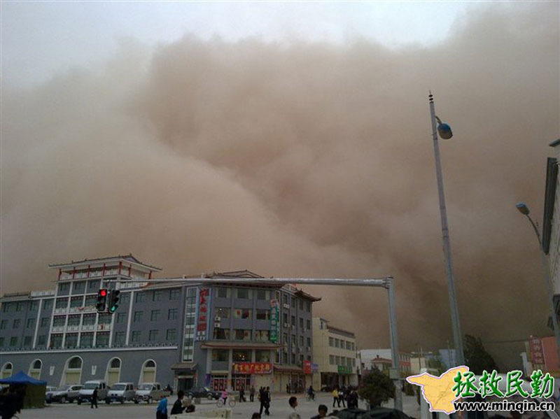 4月24日起,甘肃遭遇今年第三次区域性的沙尘暴天气过程。敦煌、酒泉、张掖、民勤等13个地区出现沙尘暴、强沙尘暴和特强沙尘暴(黑风暴),其中民勤县在当天傍晚时分的能见度接近0米。来源:拯救民勤网