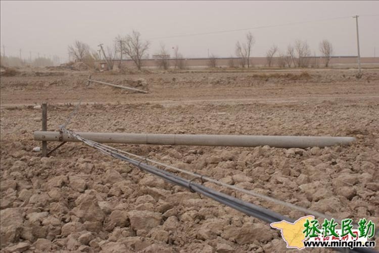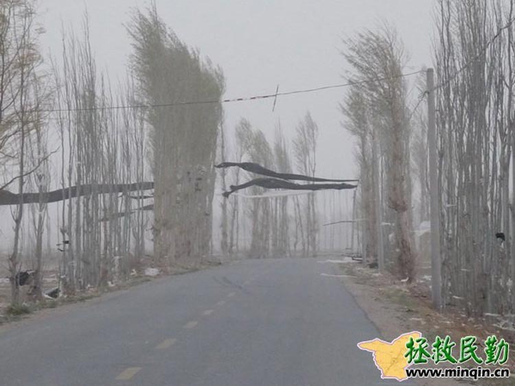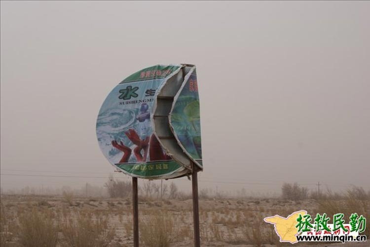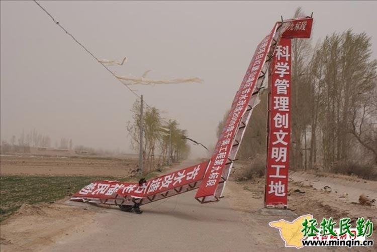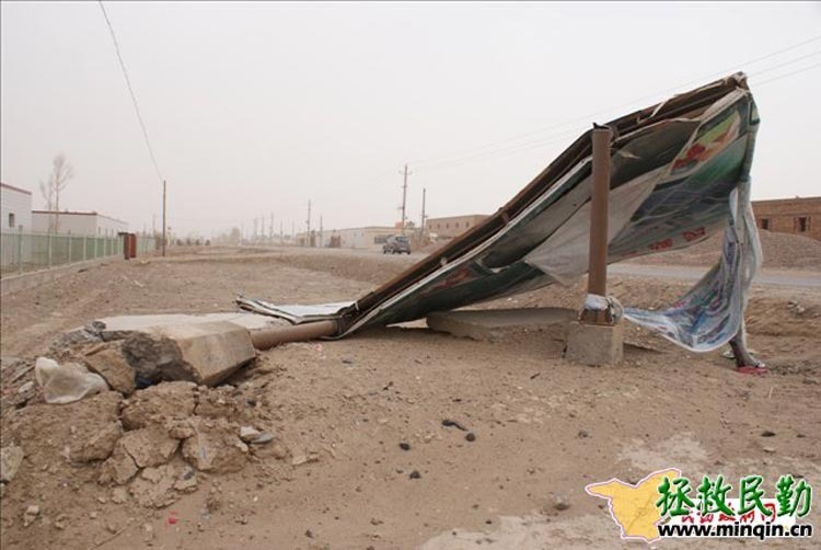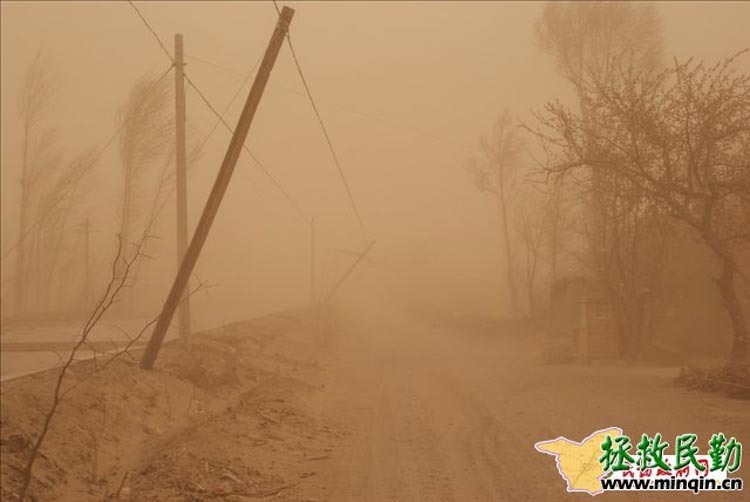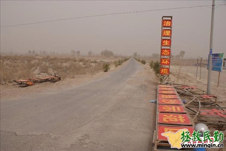 4月24日起,甘肃遭遇今年第三次区域性的沙尘暴天气过程。受特强沙尘暴侵袭,民勤县道路两侧广告牌、彩门及部分电力、通讯线路等受损严重。来源:拯救民勤网
