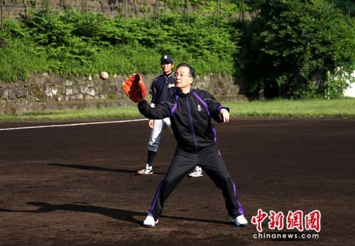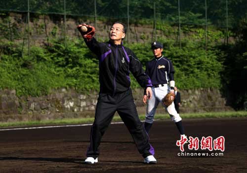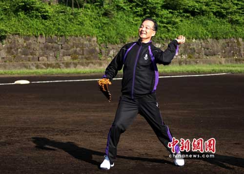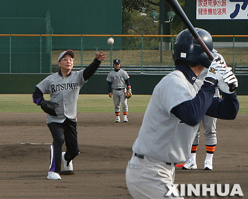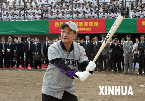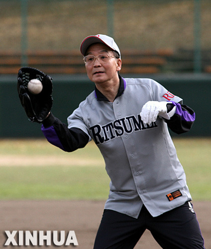 资料图:2007年4月13日,正在日本正式访问的中国国务院总理温家宝在京都西新京极棒球场与日本立命馆大学棒球俱乐部队员切磋棒球技艺。新华社记者