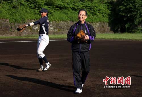 2010年5月31日早晨,正在日本访问的中国总理温家宝来到东京上智大学,与该校大学生一起打棒球。摄影:周兆军