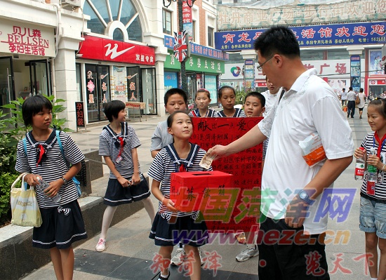 “谢谢叔叔!”“谢谢阿姨!”“谢谢哥哥!”“谢谢奶奶!”“谢谢弟弟!”……6月26日,在热闹的市东方红大街,本报小记者、菏泽学院附属小学五年级2班学生高纹、刘思彤、黄广男等为学弟小天浩策划的募捐活动吸引了大批市民。