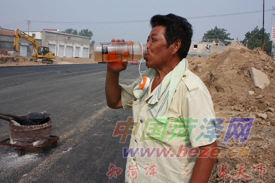 7月6日16时许,菏泽城区的最高气温达37.6℃,滚滚热浪使很多人躲进室内不敢出门。然而此时,在市中山路施工现场,铺路工人们却顶着炎炎烈日,脚踏刚刚摊铺的沥青路面,正干得热火朝天。