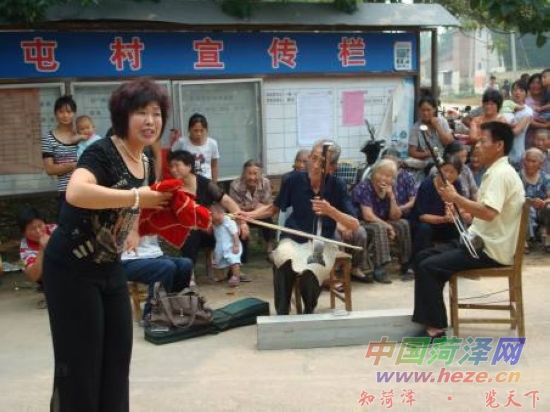 定陶县孟海镇有一批戏曲发烧友,每到茶余饭后就聚到一起,拉起二胡,唱起小戏,精彩纷呈的戏曲演出在为广大农民群众送来丰盛的文化大餐的同时,也给酷暑天气带来了一股清凉之风。图为8月26日孟海村的戏曲票友孟爱云在牛屯村为农民群众演唱豫剧《大祭桩》选段。