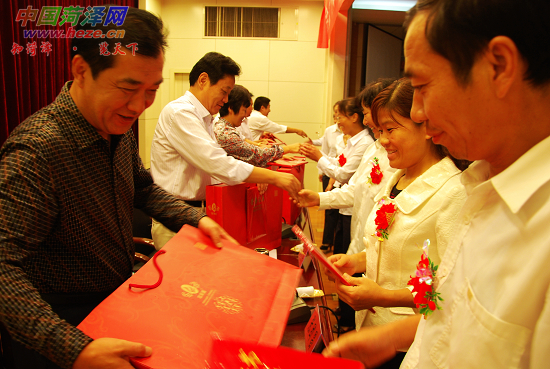 “老师,真想再听一听您的课,我可能很难再遇到您这样真正知心如朋友如家长的老师了!”9月10日上午,牡丹区二十一中英语老师郭红星读着已经升入高中的学生的信和贺卡,禁不住几次落泪。初一的几位学生向自己的老师鞠躬至谢,祝老师节日快乐(上图)。除一些学生送鲜花、贺卡之外,还有很多学生选择在教师节这天给老师倒一杯水,送上一句祝福,改掉一个坏习惯,写封信表一表决心等方式来表达对老师的感谢和敬意。