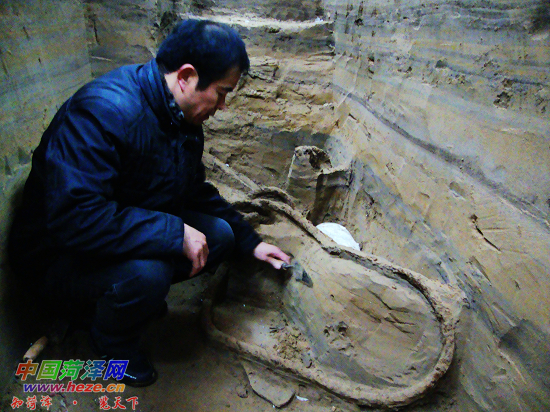 13日一早,菏泽市区最低气温降至零度以下。上午8时许,记者赶到古沉船发掘现场时,省市数名考古人员已经就位,展开发掘工作。